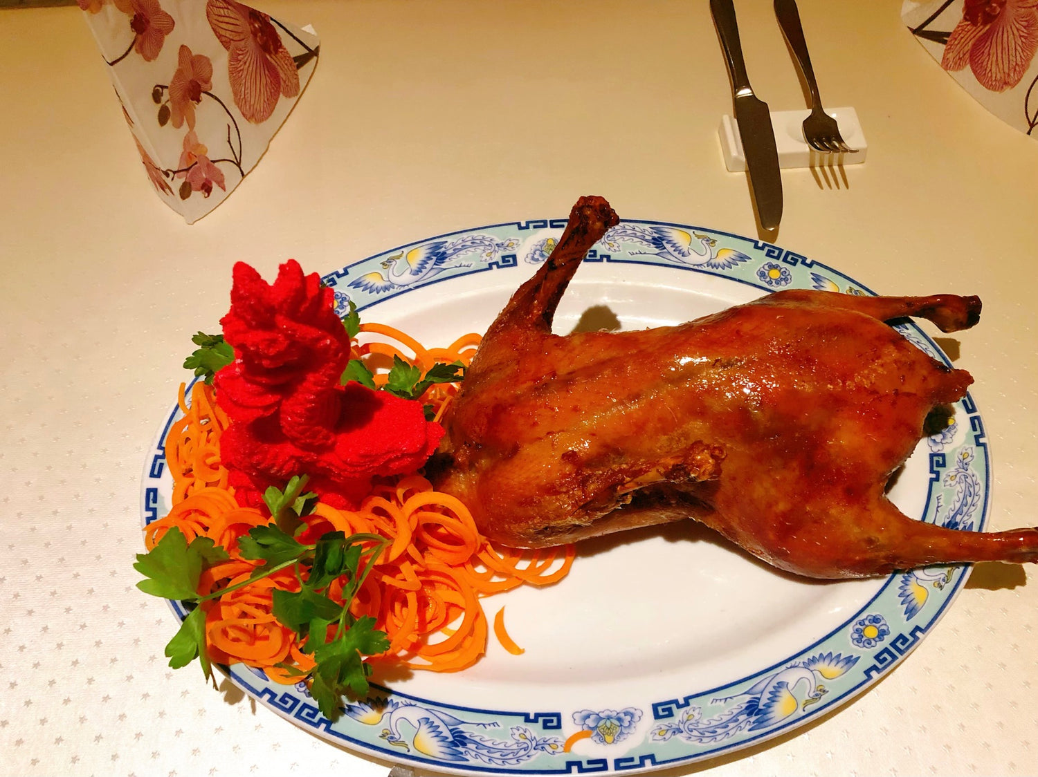 - Knusprige Entenhaut serviert mit chinesischem Kuchenteig und Soße
